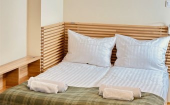 Apartament składa się z salonu połączonego z kuchnią, sypialni, łazienki, wc i przedpokoju z