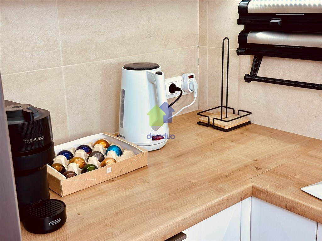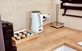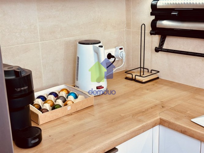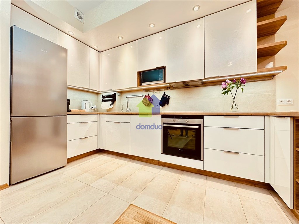 Kuchnia w pełni wyposażona w piekarnik, płytę indukcyjną, lodówkę, zmywarkę, naczynia i akcesoria.